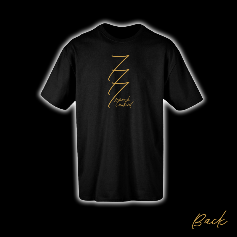 The back of the shirt prominently features the 777 logo, a symbol of divine completeness, faith, and inner strength. Available in white or gold, this subtle yet eye-catching detail adds a layer of sophistication, making the t-shirt versatile for various occasions.