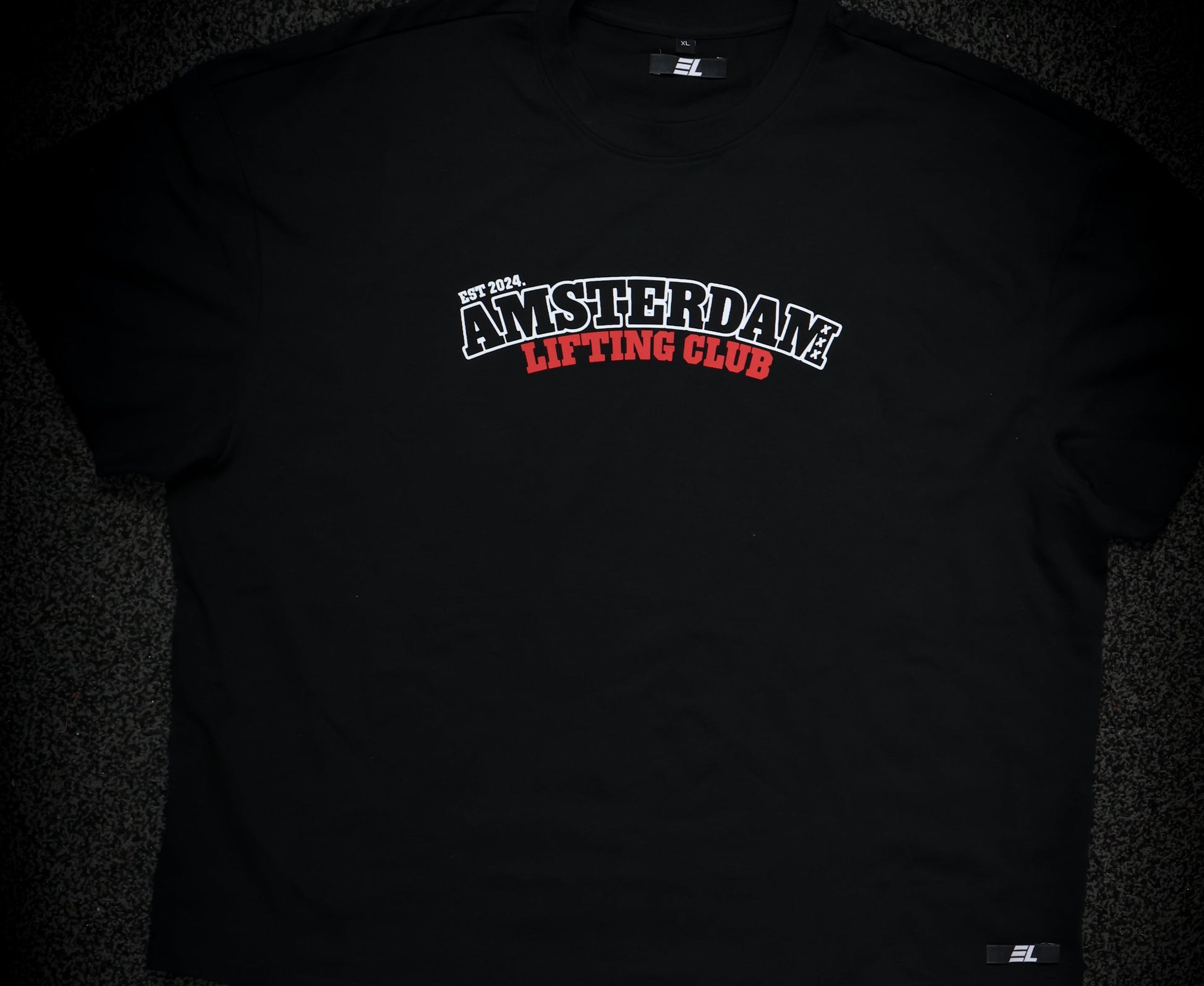 This black tee features the Amsterdam Lifting Club chest graphic and comes in a relaxed oversized fit, perfect for training or streetwear.